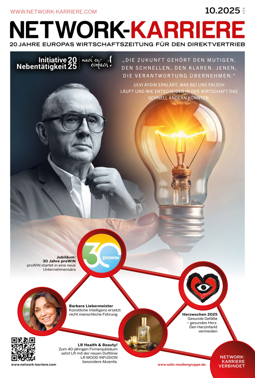 Erhalten Sie die Print-Ausgabe der Network-Karriere zwölf mal versandkostenfrei nach Hause oder zu Ihnen ins Unternehmen, OHNE automatische Vertragsverlängerung. Genießen Sie als Leser exklusive Interviews und aktuelle Branchen-News. Darüber hinaus entnehmen Sie dem Trainingsbereich der Network-Karriere wissenswertes rund um die Themen Verkauf und Direktvertrieb.